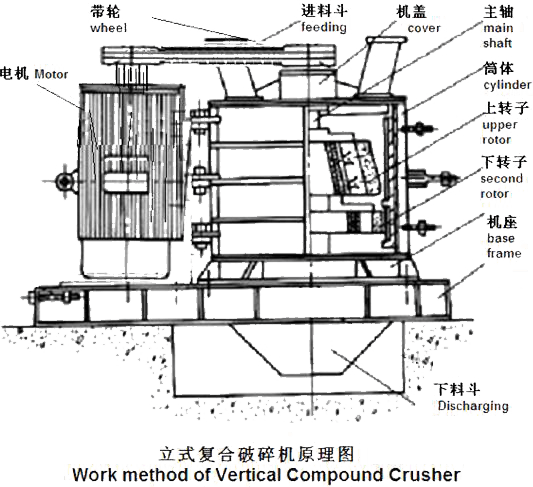 块状矿石由进料斗落入破碎腔内料盘上,借助甩料盘的离心力将物料抛向筒体的内壁,与安装在内壁上的反击村板猛烈碰撞,同时物料互相撞击,使之达成初级破碎,接着物料进入锥形转子腔后,在锥形空间呈螺旋状下落,经冲压、挤压,使其他矿石物料进一步被破碎。由于锥形转子与村板间的斜度,促使较小的物料向下滑落,达到由大到小自动实现分级分段破碎,物料在锥形转子腔内受锤头的打击,高速运行的板锤与块料再次与反击板碰撞、物料流相互碰撞使物料经打击、撞击、剪切、挤压面进行二或三级破碎,达到多级破碎,从而提高破碎效率。